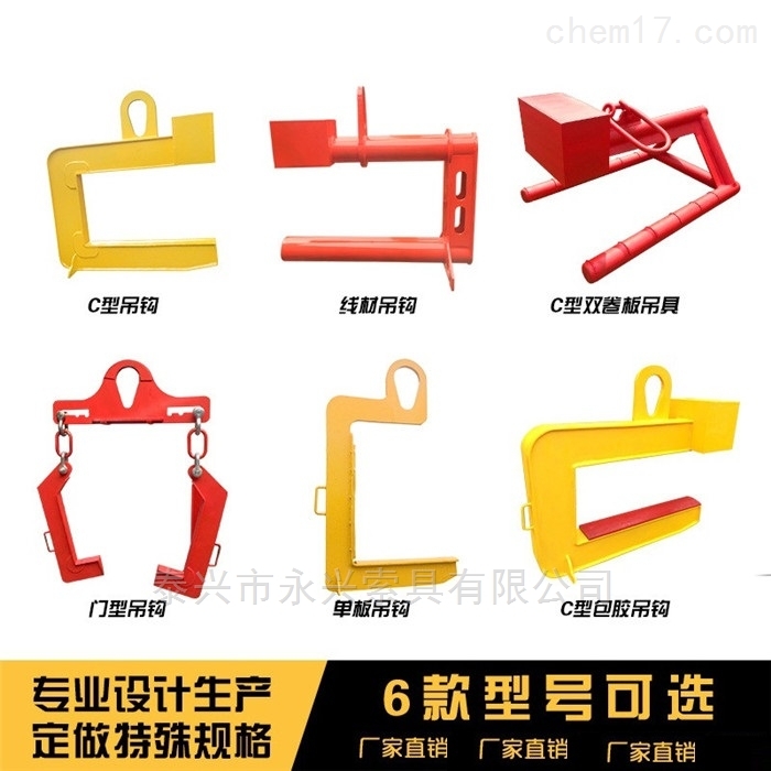 钢卷吊具有C型钢卷吊具,液压吊具,卧卷自动吊具,竖吊具,电动卧卷夹具,电动旋转卧卷夹具。适用于钢卷搬运,钢卷回火,仓库存放堆垛,运输装卸等。可根据使用要求进行选择设计。